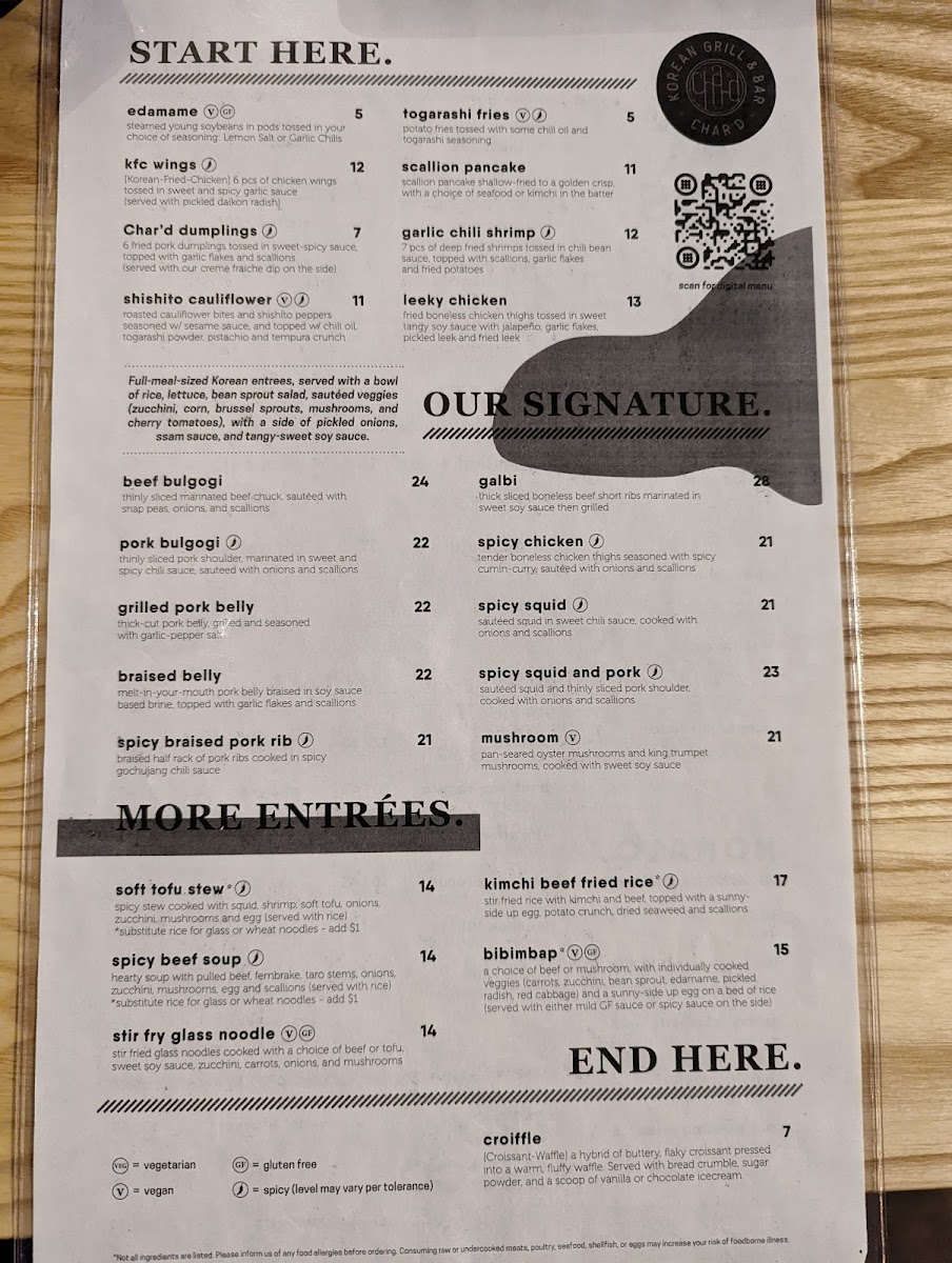 Char'd's sides are equally enticing; the Ssam Set harmoniously pairs with signature entrees, creating a delightful dining experience. Highlights include the Rajogi, a crispy fried chicken tossed in a zesty sauce, and the Beef Galbi, offering marinated short ribs grilled to perfection. With a modern ambiance and attentive service, every visit promises a sensational journey through Korea’s rich flavors. Join us at Char'd, where each bite is an invitation to savor the extraordinary.